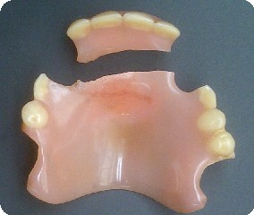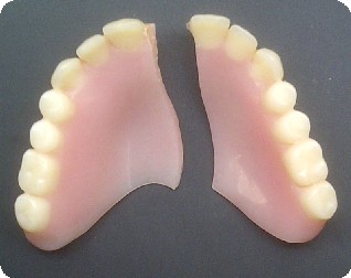 There are two types of denture breaks that a repair provides a lasting solution to. These are breaks in stress free areas of dentures that have been caused only by dropping the denture and bonding failures where the denture tooth has become detached from the pink base, see photos.
